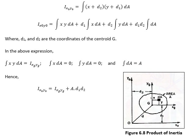 Therefore, the product of inertia with respect to any pair of axes in its plane is equal to the product of inertia with respect to the parallel centroidal axes plus the product of the area and the coordinates of the centroid with respect to the pair of axes.