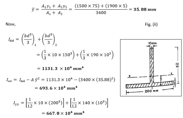 Example-2 Find the moments of inertia Ixx and Iyy for a T-section shown in the Fig. (ii).