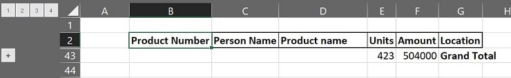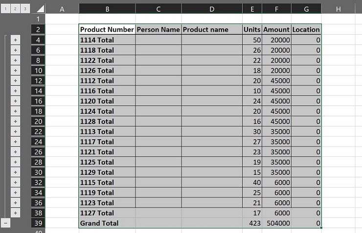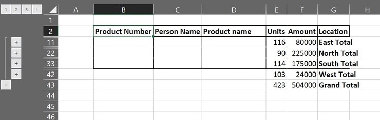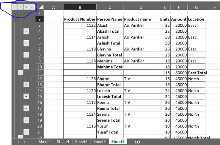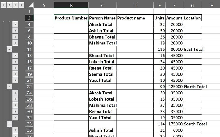 Then click ok grouped with four levels and the subtotals are calculated location wise and name wise with having 4 outline levels.