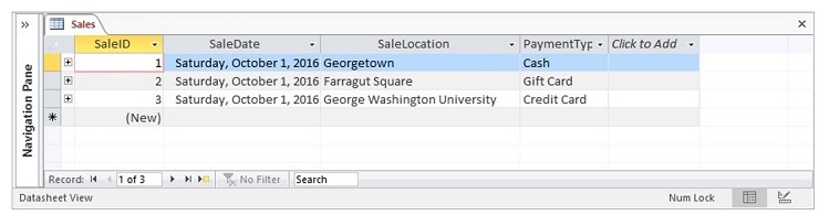 - Switch back to Datasheet view to add sample records to the Sales