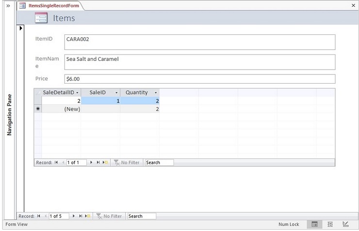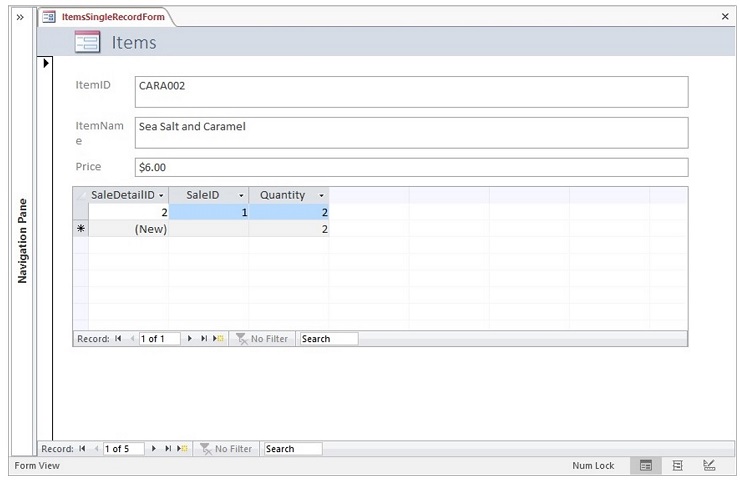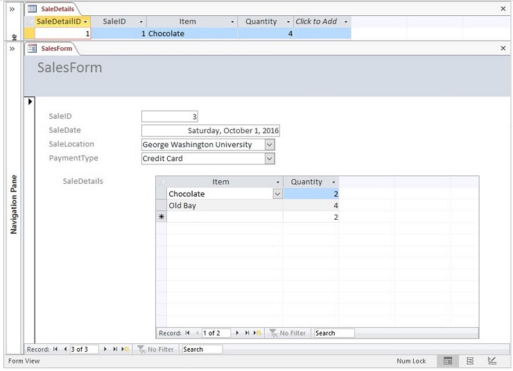 - View the form data by records in the Sales table with related records in the SaleDetails table displayed in a subform.