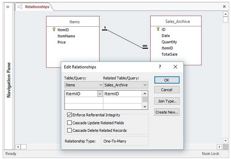 - Use the Relationships window to create a relationship between the Items and SalesArchive