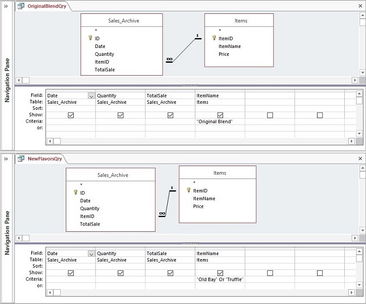 - Add the criteria Old Bay or Truffle to the ItemName Run the query to check your work. (Hint: There should be 55 records in the query results.)