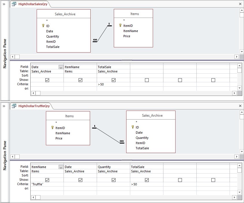 - Create a one-to-many relationship between the ItemID field in the Items table and the ItemID field in the SalesArchive You may rearrange the tables in the Relationships window if you want.