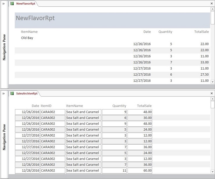 - Include the fields from the NewFlavorsQry query in this order: ItemName, SaleDate, Quantity, and TotalSale.