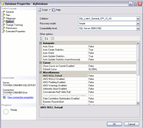 The Properties dialog contains a large number of options for changing the configuration of your database. For now, we can leave everything at its default setting.