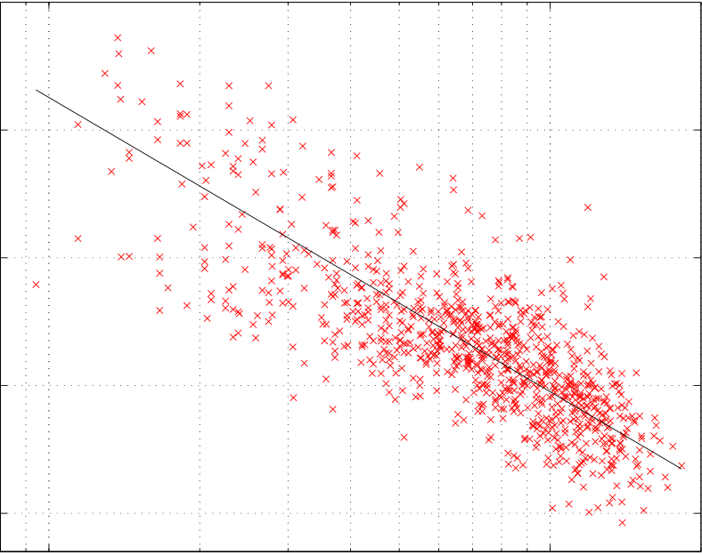 Fig. 5. Measured wideband path gain (x) as a function of path length. Linear fit (—) is with d0 = 1m, np = 2.3,