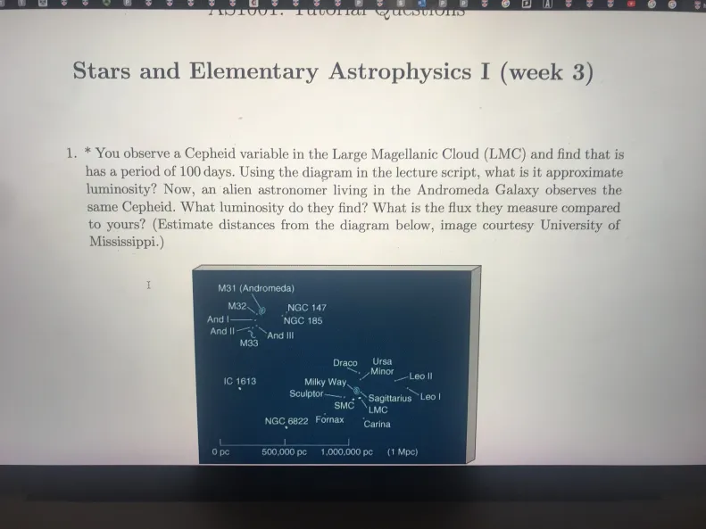 1. You observe a Cepheid variable in the Large Magellanic Cloud (LMC) and find that is has a period of 100 days. Using the diagram in the lecture script, what is it approximate luminosity? Now, an alien astronomer living in the Andromeda Galaxy observes the same Cepheid. What luminosity do they find? What is the flux they measure compared to yours? (Estimate distances from the diagram below, image courtesy University of Mississippi.)