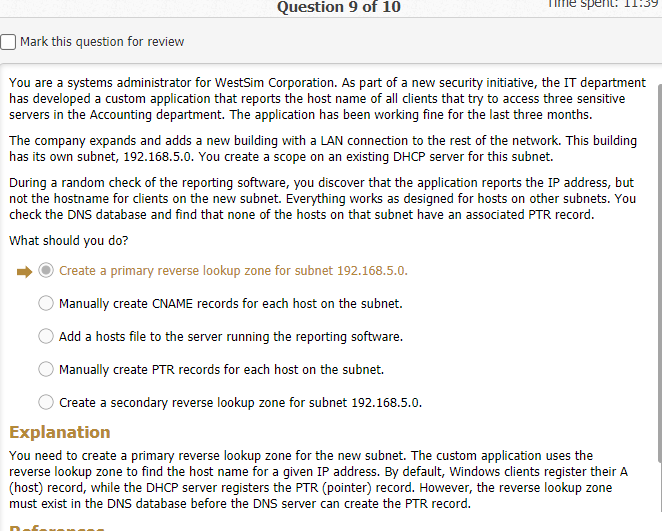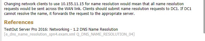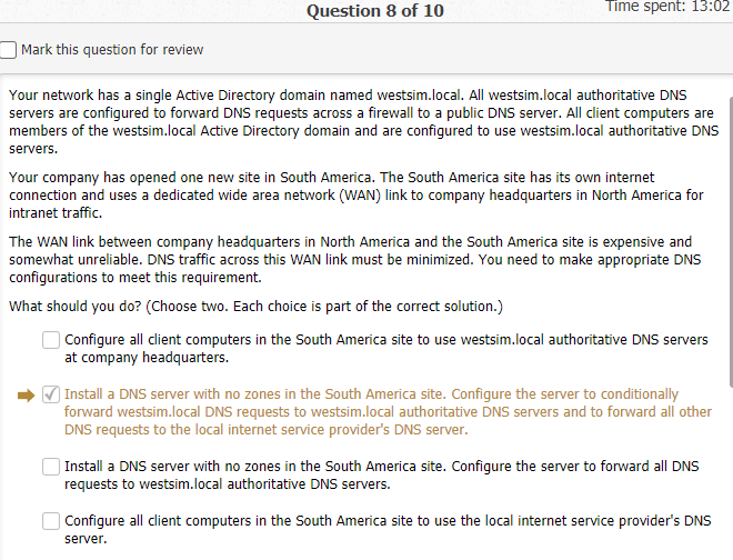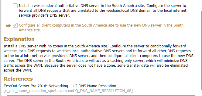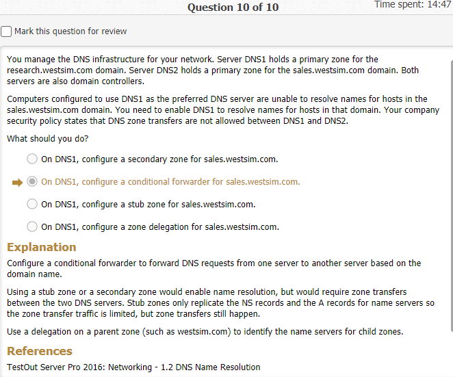 You ae the network administrator for westsim.com. the network consists of two active directory domains named westsim.com and sales.westsim.com. the dns server in the westsim.com domain are authoritative for the westsim.com dns domain. The dns servers in the sales.westsim.com domare are authoritative for the sales.westsim.com dns domain. All the servers run windows server 2016. All the clients run windows 10.