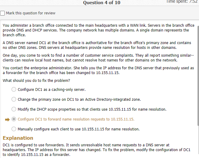 You administer a branch office connected to the main headquarters with a wan link. Servers in the branch office provide dns and dhcp services. The company network has multiple domains. A single domain represents the branch office.