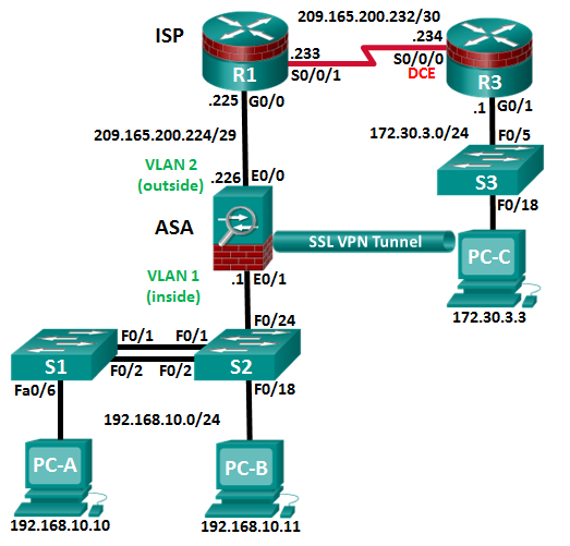In Part 7, you will configure an AnyConnect SSL remote access VPN on the ASA using ASDM. You will then use a browser on PC-C to connect and download the Cisco AnyConnect Secure Mobility Client software located on the ASA. After the software has downloaded, you will manually install the AnyConnect software to PC-C and use it to establish a remote SSL VPN connection to the ASA.