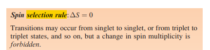 The spin selection rule: The spin selection rule states that the total spin angular momentum of a molecule or atom cannot change during a transition. This means that a molecule or atom can only absorb or emit a photon if the spin of the excited state is the same as the spin of the ground state. For example, a singlet molecule can only absorb or emit a photon if the excited state is also a singlet state. A triplet molecule can only absorb or emit a photon if the excited state is also a triplet state.