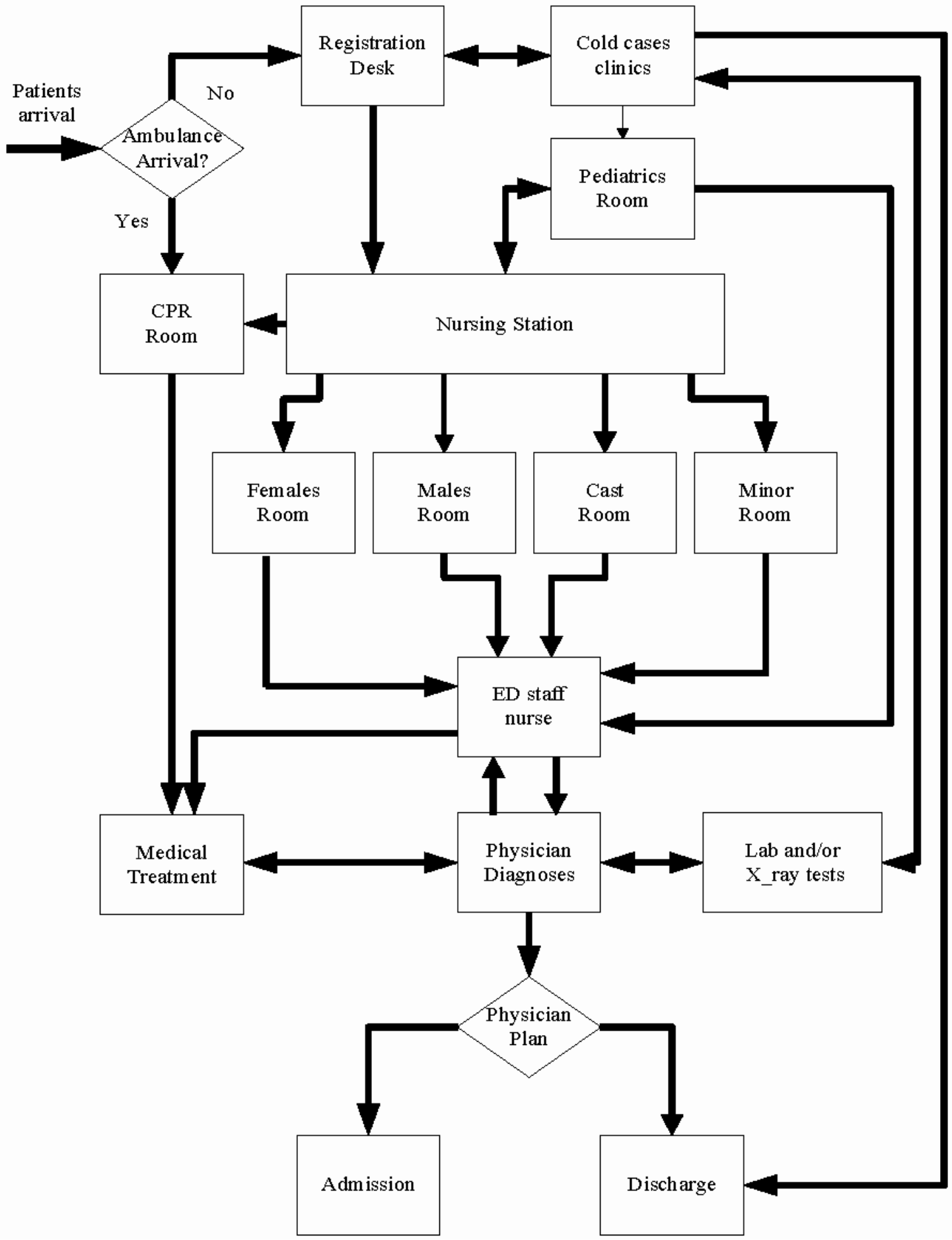 Based on the QFD tool, the triage process will be the core process in the ED. The triage station will be located where a triage nurse can monitor both the arriving patients who must be triaged and patients who have been triaged and are waiting for medical treatment. A new patient flow will be developed using the triage concept, as shown in Figure 3.