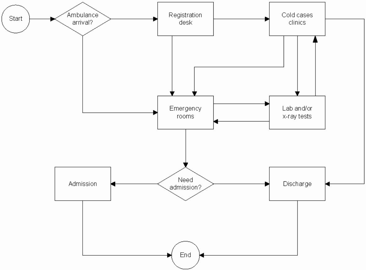 Depending on their chief complaints, patients will be directed to either the emergency rooms or the cold case clinics. If the physician at the cold case clinics diagnoses a patient as a non-cold case, that patient will be referred to the emergency rooms. In this project, the process terminates once the patient is either discharged or admitted to the hospital.