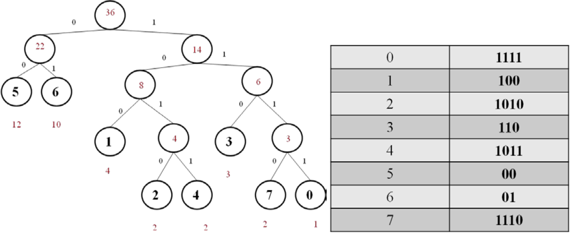 Huffman coding: Each pixel in a PGM image is represented by one byte or 8 bits. Huffman coding compresses an image by encoding the pixel values so that not all pixel values require 8 bits of storage.The key idea is assigning fewer bits to pixel values that appear more frequently in the image and more bits to pixel values that appear less frequently in the image. As a result, the size of the compressed image is smaller than the original one. Let us consider the 6x6 image shown below where every pixel is encoded using 8 bits. Storing this image would require 36x8= 288 bits. Since pixel values are between 0 and 7, we could assume 3 bits per pixel only; in this case, storing the image would require 36x3=108 bits. Using Huffman coding, however, it would require 93 bits.
