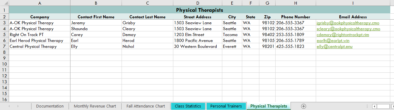 Select the Class Statistics, Personal Trainers, and Physical Therapists worksheets and then change the color of the sheet tabs to Turquoise, Accent 3 (7th column, 1st row of the Theme Colors palette).