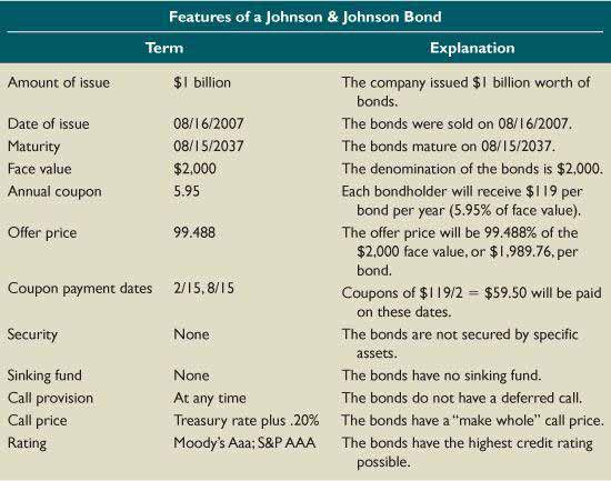 There are many other dimensions to long-term debt, including such things as security, call features, sinking funds, ratings, and protective covenants. The following table illustrates these features for a bond issued by Johnson & Johnson. If some of these terms are unfamiliar, have no fear. We will discuss them all presently.