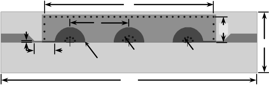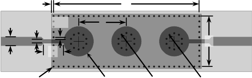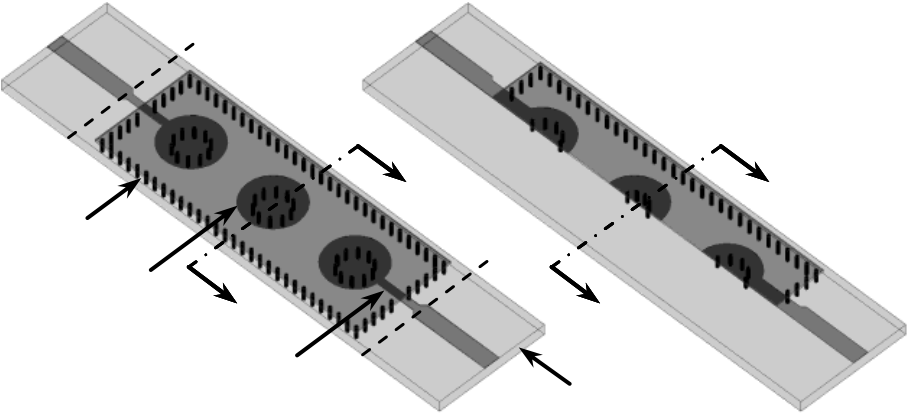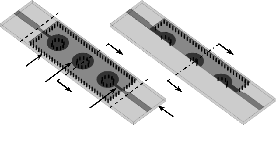 cavity cut in half along the E-plane (feed line) axis, exposing the centerline of the cavity and posts. Edges of the feed and matching lines are aligned with the centerline. In this way filter area is reduced by half. Parameters of the HMSIW filter are adjusted to achieve identical filter performance.