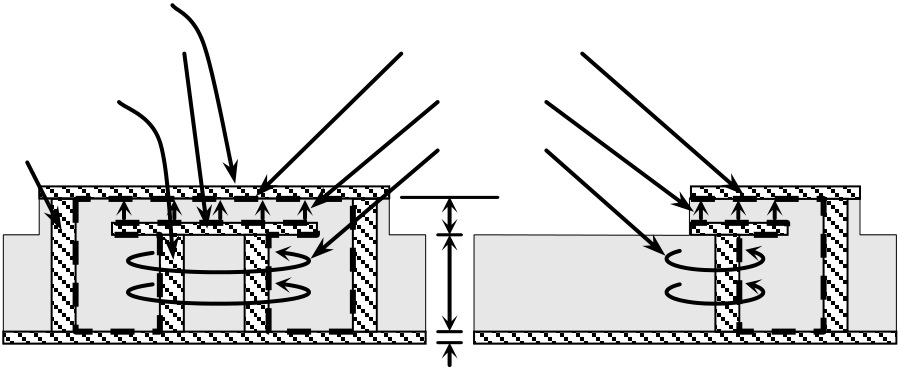 E-field at capacitive hats is shown by vertical vectors in Fig. 2 sections. H-field around resonator posts is shown with horizontal circular vectors. Current flows at the surface of the conductors inside the cavity along the path defined by the dashed lines.