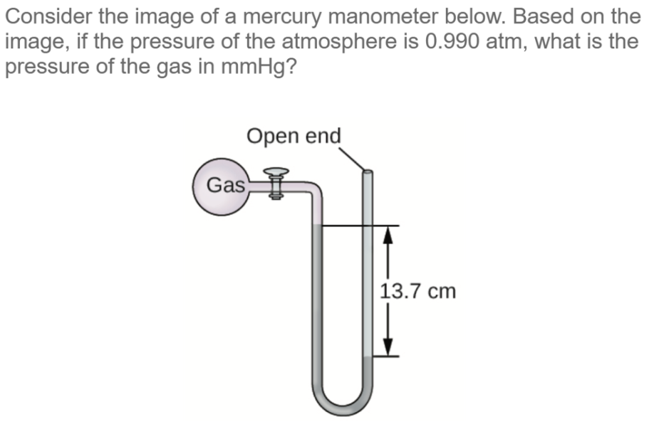 For example, if the pressure of the atmosphere is 760 mmHg and the difference in the height of the mercury columns is 100 mm, then the pressure of the gas sample is 660 mmHg.