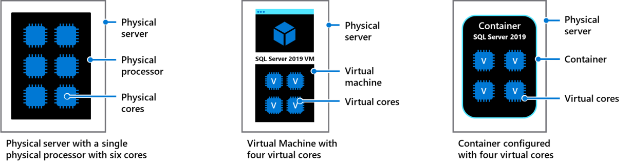 This figure depicts the representations of the physical server, physical processor, physical and virtual cores, virtual machines and containers that are used in this guide.