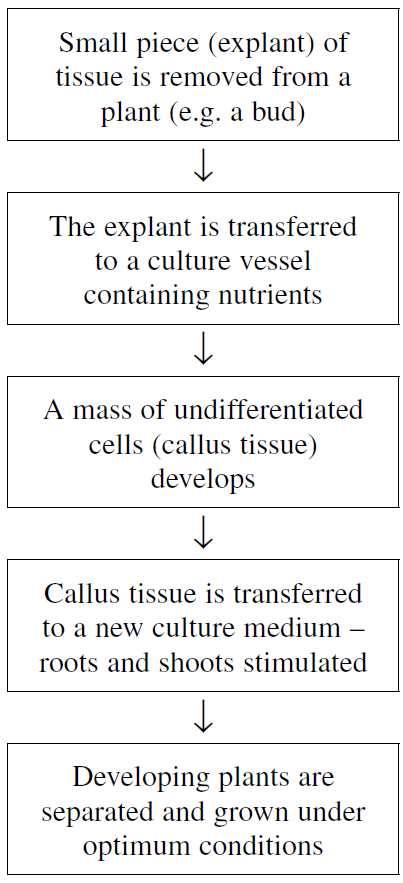 * Tissue culture is a method of artificial propagation in plants. One technique for carrying out tissue culture is to remove meristems from shoot tips of plants and culture them as shown in the diagram below.magnified view