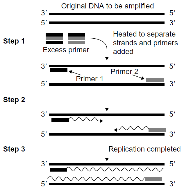 (2 marks) b The polymerase chain reaction (PCR) enables many copies of DNA to be made from a small sample. The diagram below summarizes the procedure.