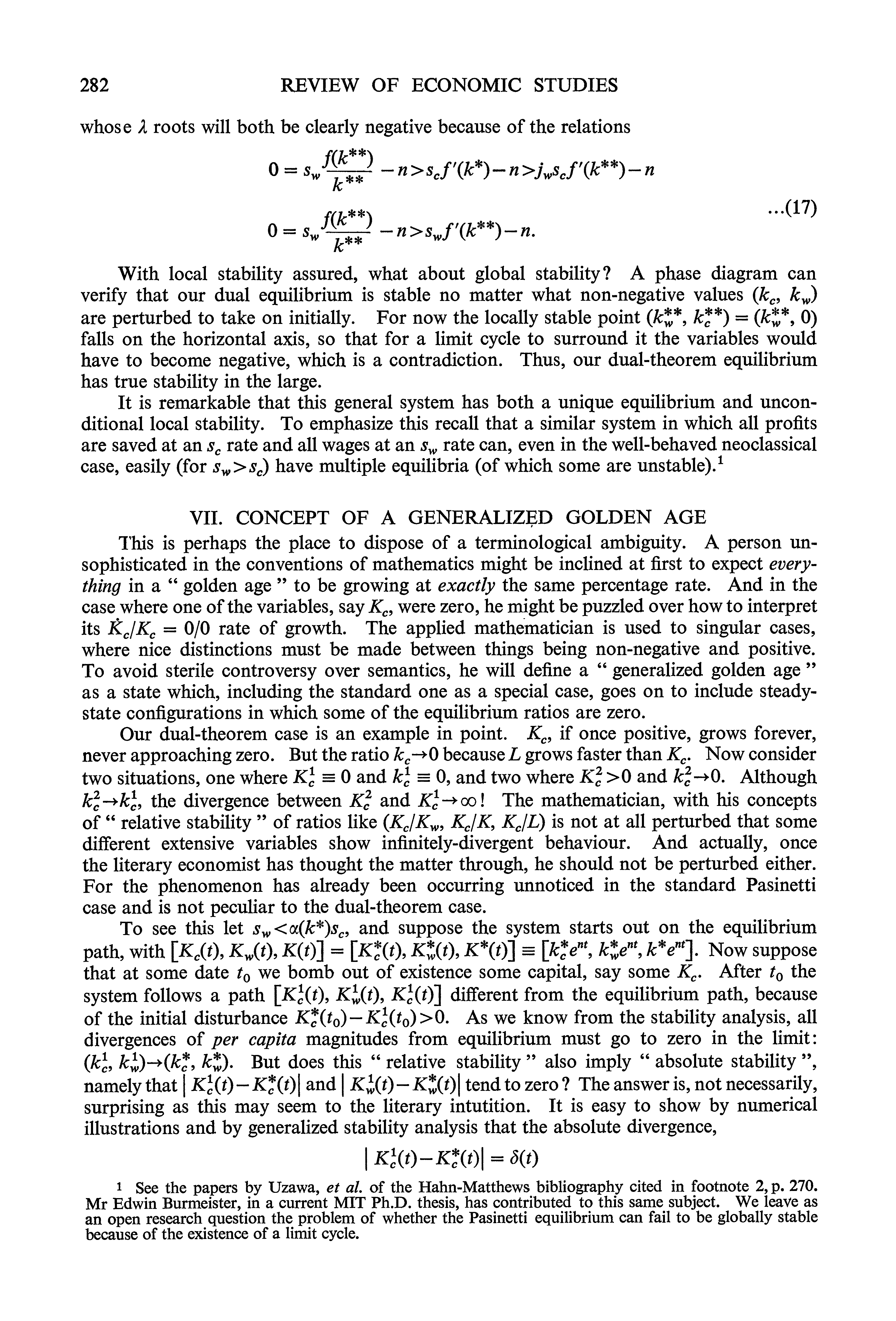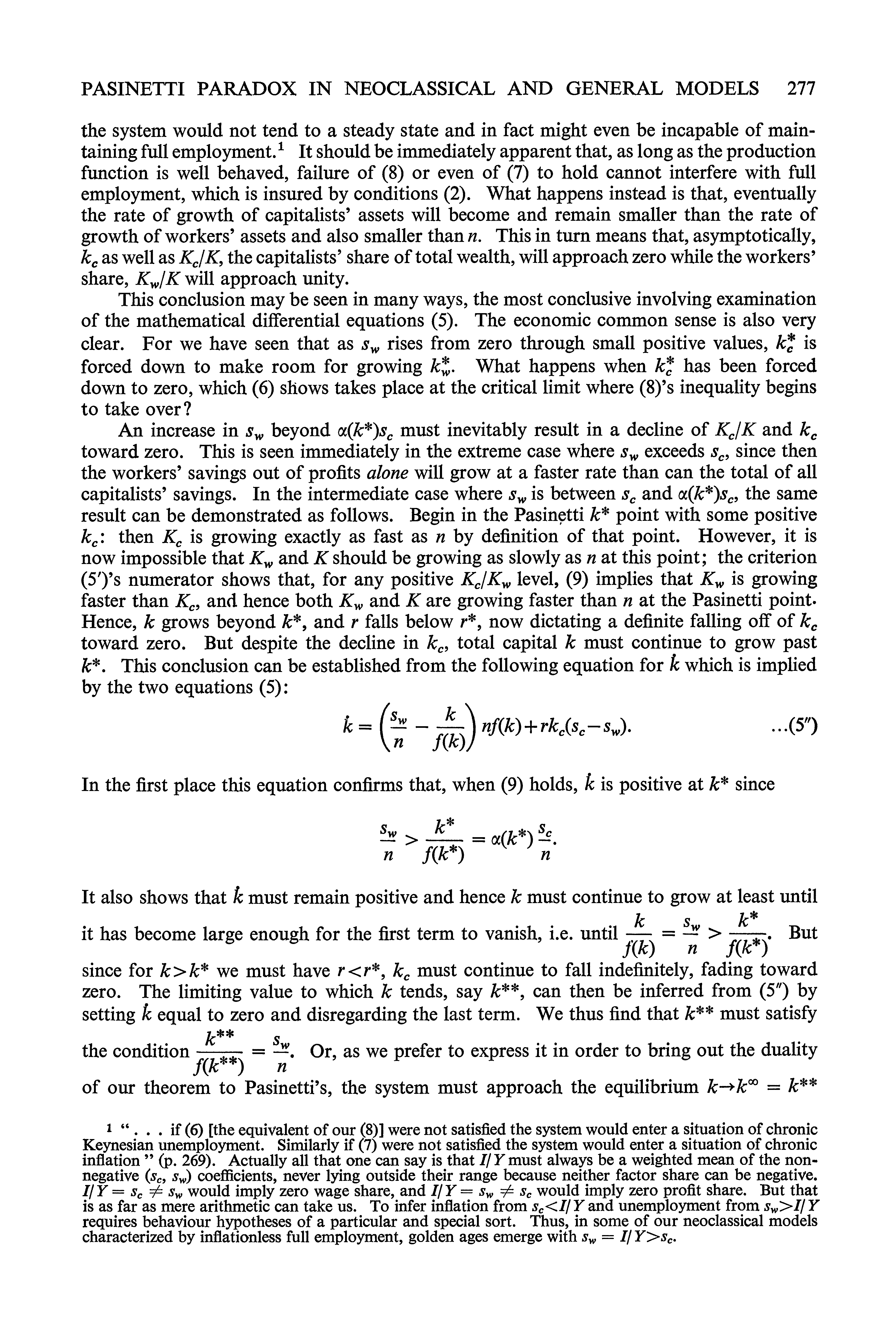 i.e. the workers' saving propensity must be smaller than that of the capitalists if Pasinetti's theorem is to hold. This same inequality is implicit in Pasinetti's inequality conditions (6) and (7). But we must hasten to add that, though (7) is necessary for Pasinetti's theorem (as we have characterized it) to apply, and though (7) is necessary for many versions of the Kaldorian theory of income distribution to yield economically meaningful results, (7) has in general nothing to do with the existence and stability of a steady-state full employment equilibrium, as we shall presently show explicitly.