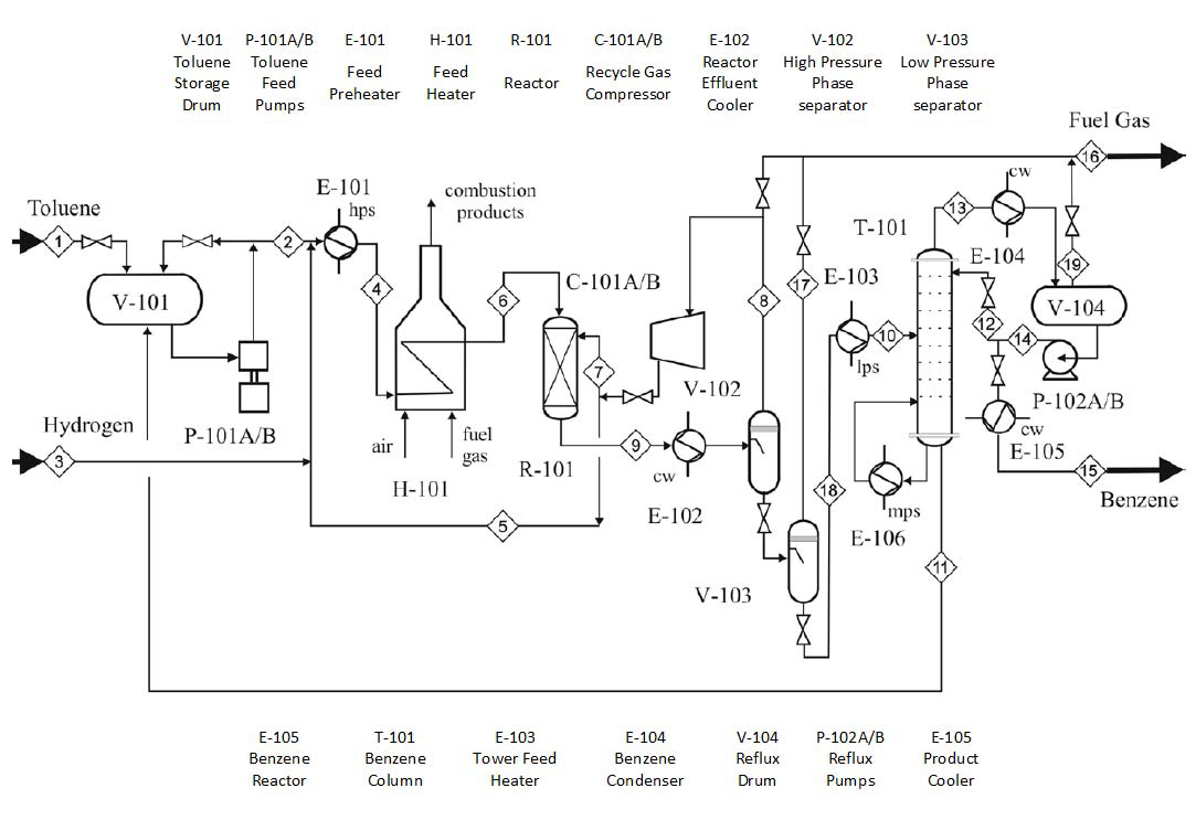 Toluene and hydrogen are converted in a reactor packed with chromium, molybdenum, or platinum oxide catalyst at 500-600 °C and 40-60 bar pressure to produce benzene and methane. Typically, the reaction reaches a conversion of 90%. Figure 1 shows the process flow diagram of the process.