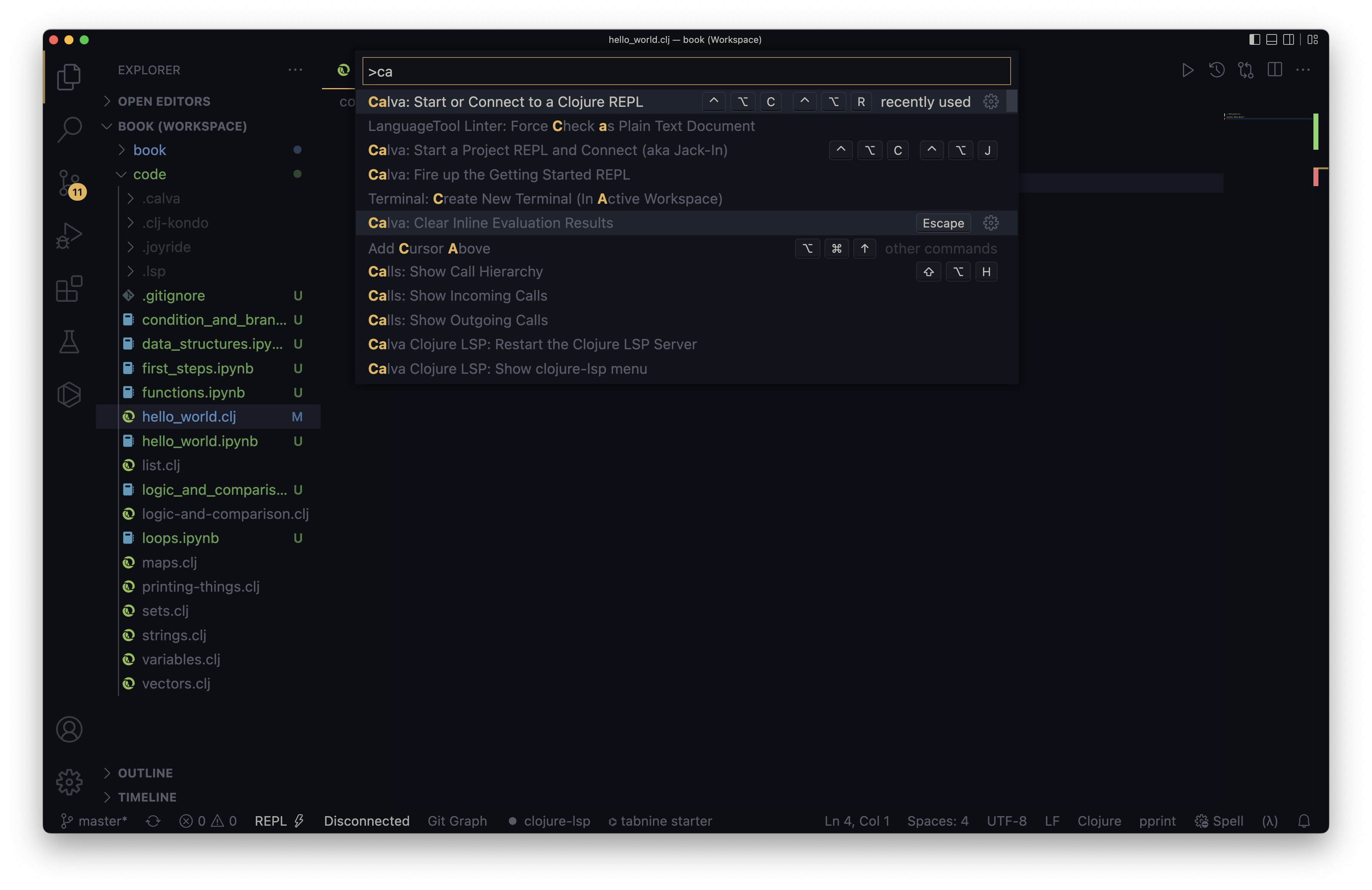 So what really happened when you typed clj. The first thing was Clojure prompted you with user⇒. You typed in something into the prompt, and pressed entered, Clojure REPL Read it and Evaluated it, understood that you want to print Hello World, next Clojure Printed out the Hello World, then it also printed a thing called nil, then it Looped back again and prompted you with user⇒.