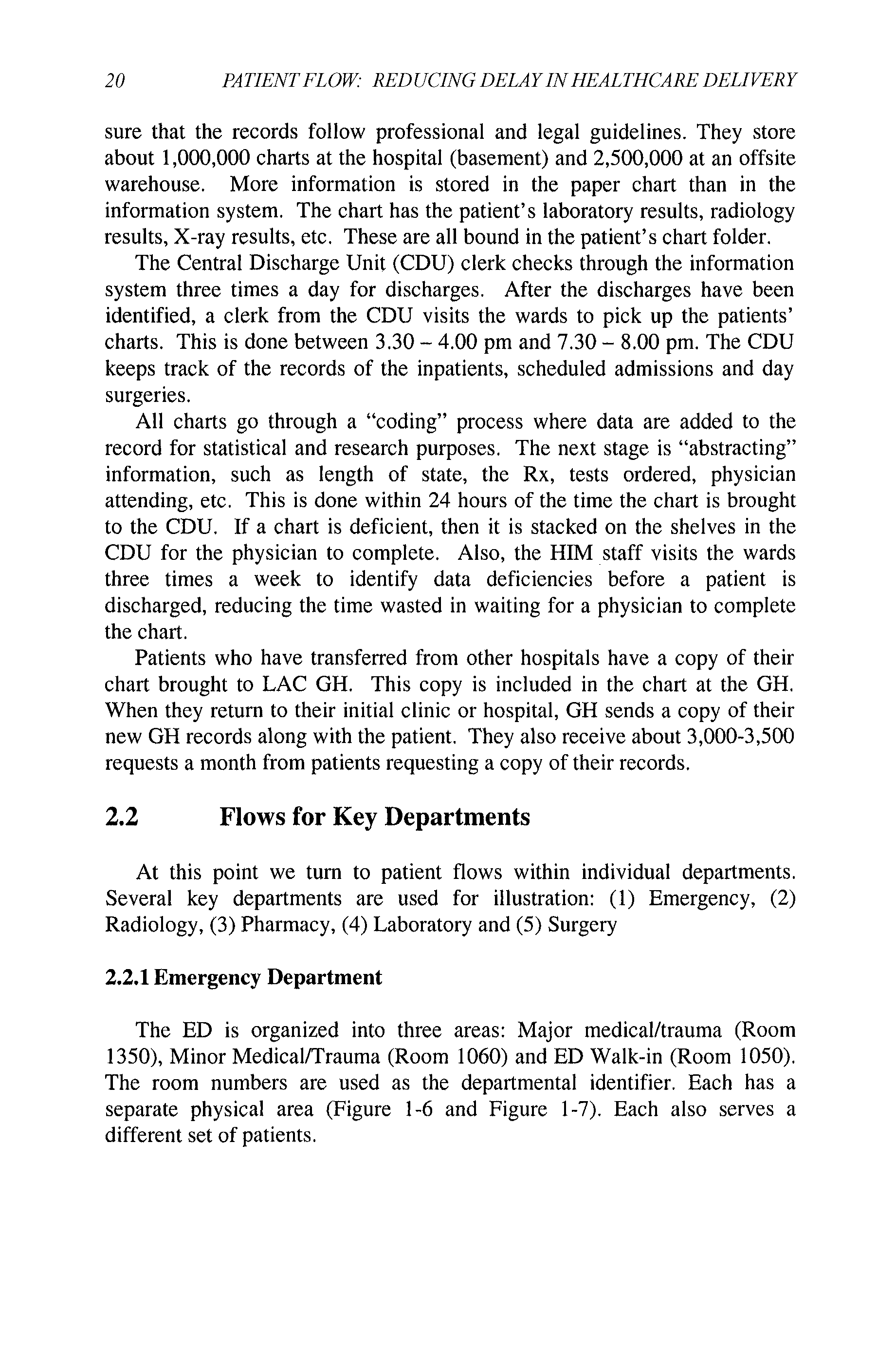 Emergency Departments (ED) are perhaps the most challenged components of the health-care system with respect to patient delay. Patients arrive at the emergency department through multiple channels, including walk-in (or drive-in) and ambulance. Depending on the nature of the emergency, the patient may be served through an ambulatory or a nonambulatory section of the emergency department. The patient ( or a friend) meets with a receptionist to collect background and information, and a nurse Patients are served by to triage (prioritize and stabilize) the patient.