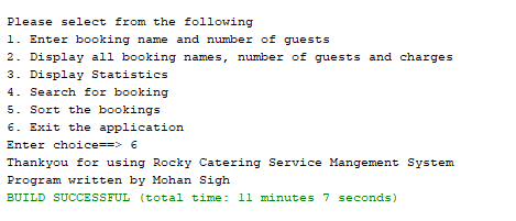 When choice 6 is selected the program will exit the application, displaying thankyou message and Programmer’s name.