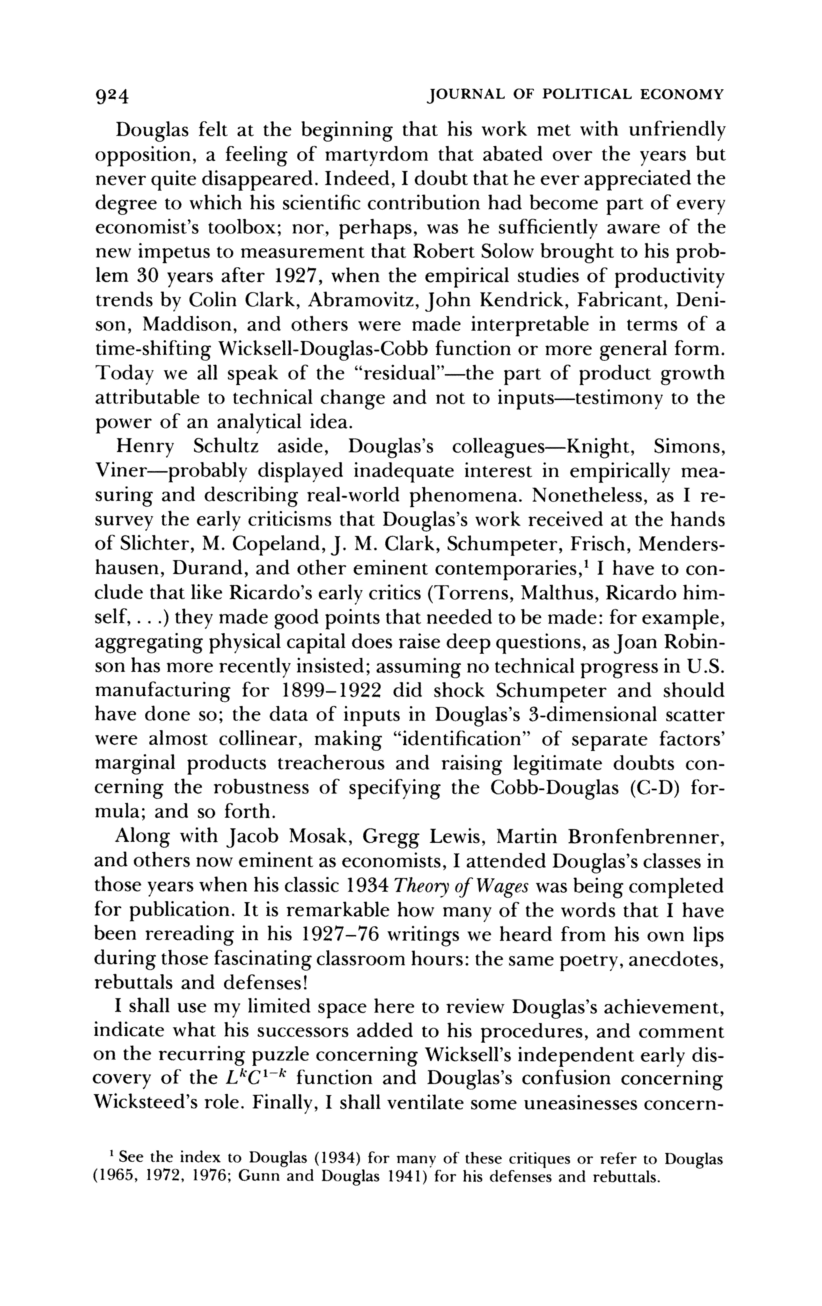 Along with Jacob Mosak, Gregg Lewis, Martin Bronfenbrenner, and others now eminent as economists, I attended Douglas's classes in those years when his classic 1934 Theory of Wages was being completed for publication. It is remarkable how many of the words that I have been rereading in his 1927-76 writings we heard from his own lips during those fascinating classroom hours: the same poetry, anecdotes, rebuttals and defenses!