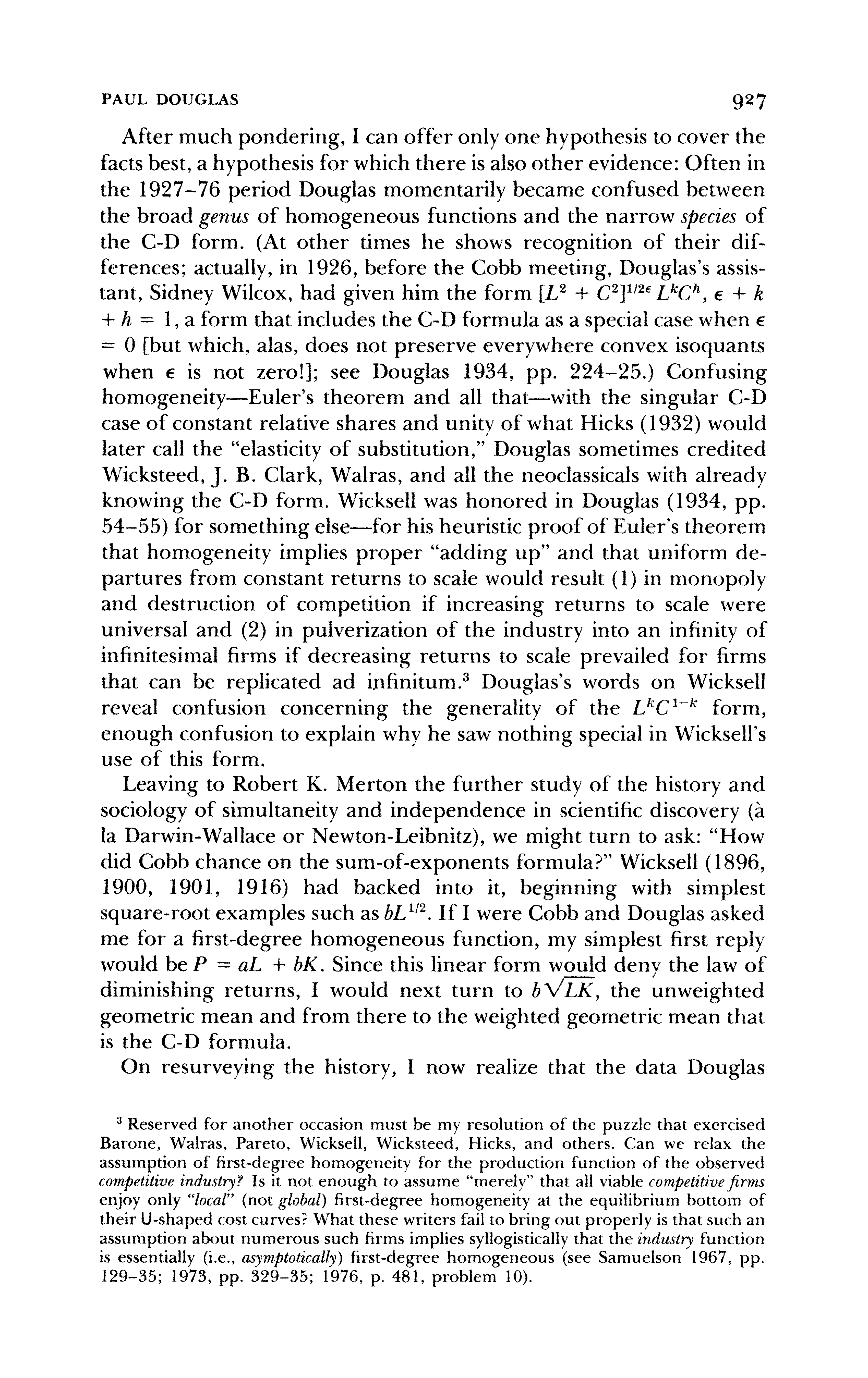 After much pondering, I can offer only one hypothesis to cover the facts best, a hypothesis for which there is also other evidence: Often in the 1927-76 period Douglas momentarily became confused between the broad genus of homogeneous functions and the narrow species of the C-D form. (At other times he shows recognition of their dif- ferences; actually, in 1926, before the Cobb meeting, Douglas's assis-