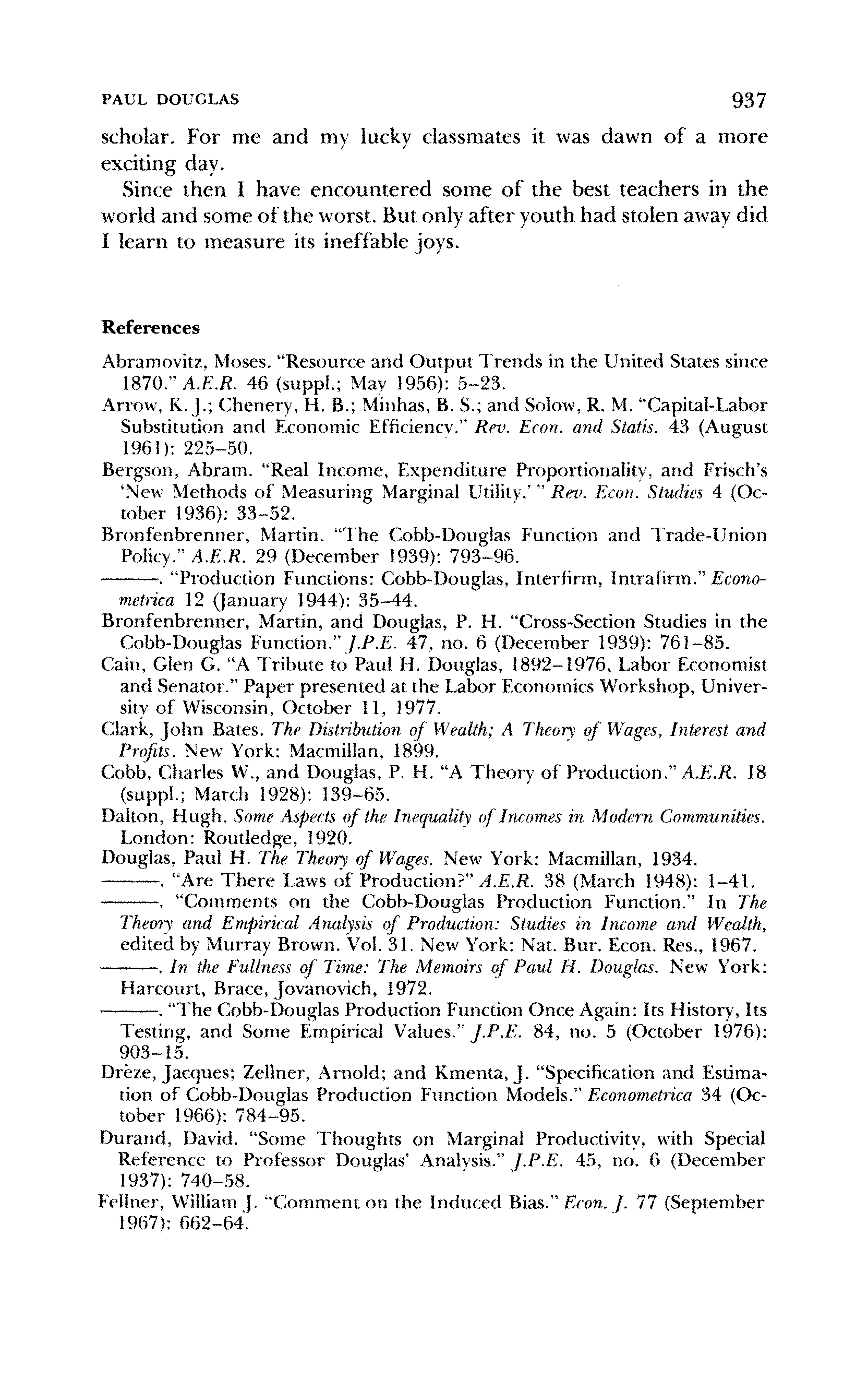 Douglas, Paul H. The Theory of Wages. New York: Macmillan, 1934. "Are There Laws of Production?" A.E.R. 38 (March 1948): 1-41.