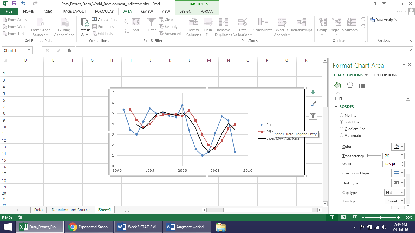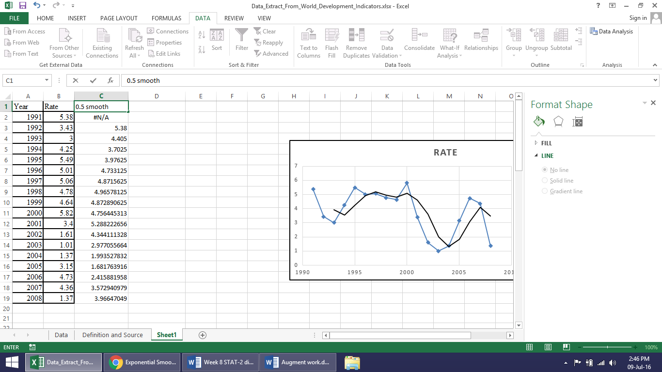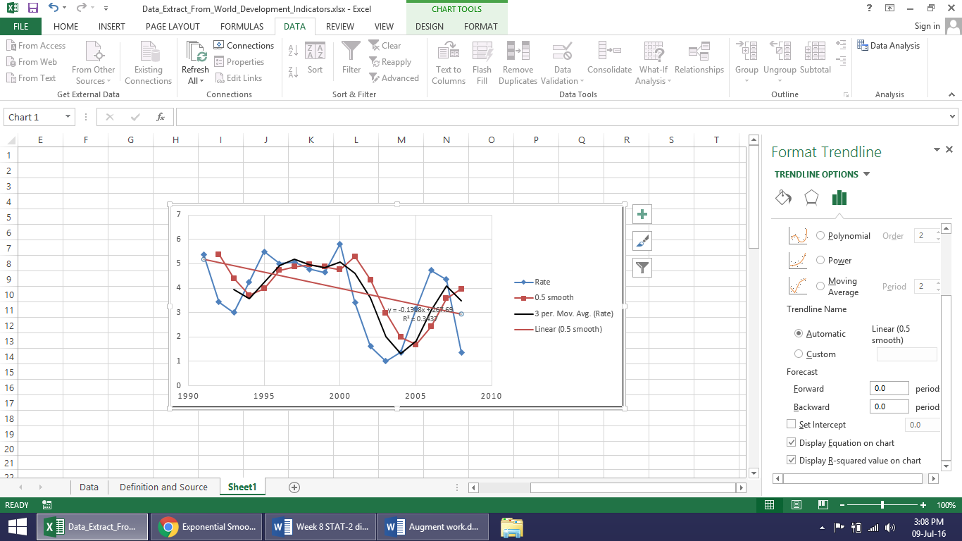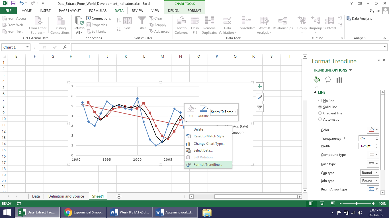 Select points the data points on the graph and right click. Click on the option add trend line. A dialogue box will appear select moving average and change the period to 3. Click ok.