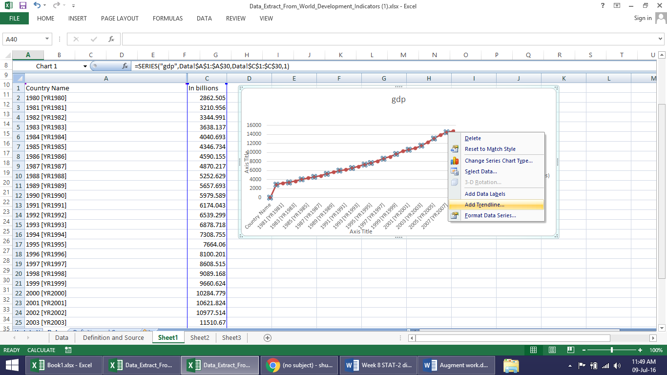 Plot a line graph. Click on insert and select icon of line graph. Select data for y axis from B1 to B30 while for x axis select data from A1 to A30. To plot a trendline select the data points right click and you will find the option of adding a trendline selct the option. Then right click on trendline and select the option of formatting trendline select display equation and R2. Click ok. The graph with all the iformation will be plotted.