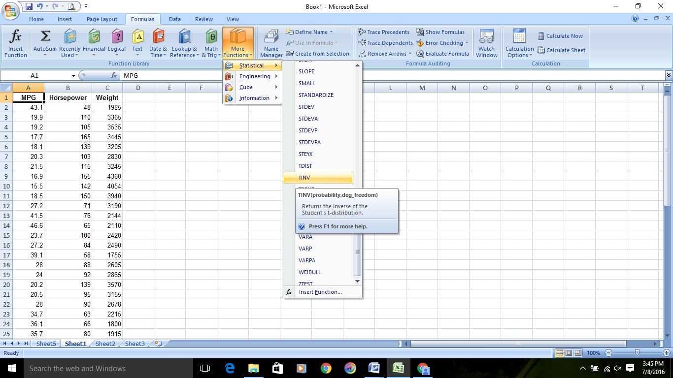 To calculatetα/2, select the TINV function in Excel (Formulas -> More Functions -> Statistical -> TINV)