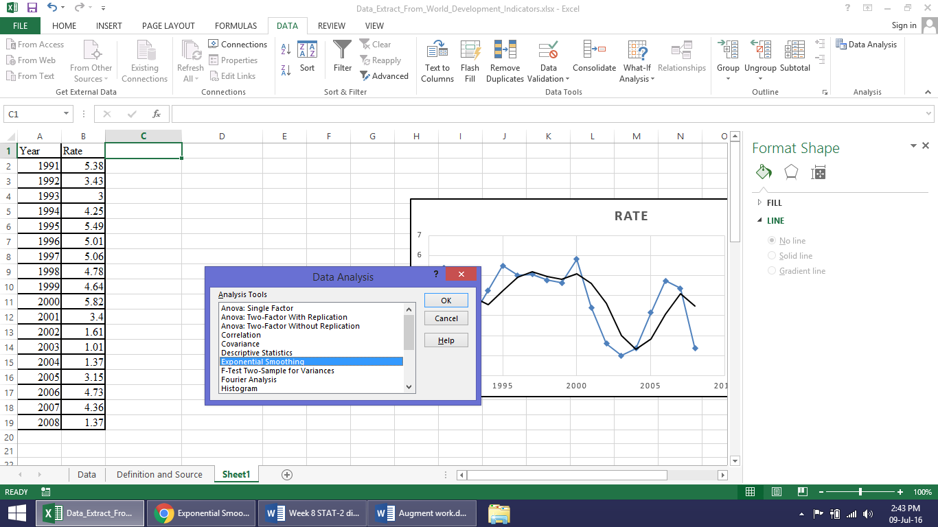 Click on data and select data analysis tool pack. A dialogue box opens. Select exponential smoothening from the dialogue box.