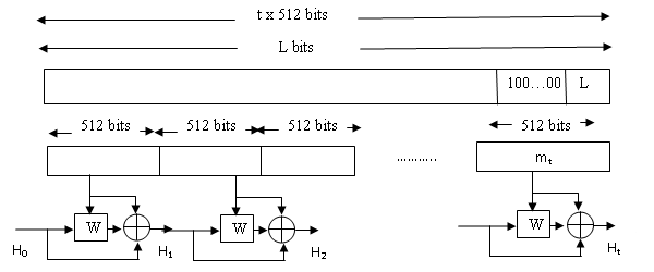 Given a message consisting of a sequence of blocks m1, m2, · · · mt, the Whirlpool hash function is expressed as follows: