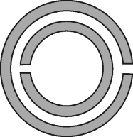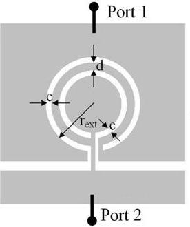 Let us now consider the application of duality to some of the previous particles. If the topology of the SRR is removed from a metallic film, the resulting particle (Figure 6) can be considered the negative image, or the complementary counterpart, of the SRR. For this reason, this particle has been called complementary split ring resonator (CSRR) [25]. It can be easily demonstrated by applying the Babinet principle, that the CSRR can be excited by means of an axial time varying electric field or by means of a magnetic field applied to the plane of the particle [26]. Under ideal conditions, i.e., a perfectly conducting and zero-thickness metallic screen, it can be demonstrated that the resonance frequency of the CSRR is identical to the resonance frequency of the SRR (provided identical dimensions and substrate are considered). Indeed, the capacitance of the CSRR, Cc, is the capacitance of a disk of radius ro−c/2 surrounded by a ground plane at a distance c of its edge. The inductance is given by the parallel connection of the two inductances of the metallic strips connecting the inner and outer metallic regions of the CSRR. These inductive values are given by Lo/2, where Lo = 2πrLpul, with Lpul being the per unit length inductance of the CPWs connecting the inner disk to ground.