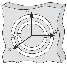 An alternative way to obtain inversion symmetry, thus overcoming bianisotropy is by introducing additional cuts in the edge coupled SRR, as Figure 4(d) illustrates [19]. This particle, called double slit split ring resonator DS-SRR, exhibits the same inductance as the SRR, but its capacitance is four times smaller since it is the result of the series connected edge capacitances of each SRR quarter. This means
