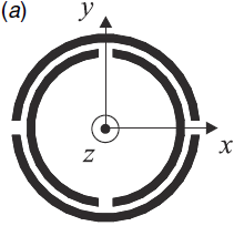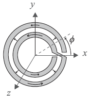 Let us begin with the SRR already considered in the previous section [12]. As long as the distance between both rings is small (i.e., there is significant coupling between them), the particle can be considered to be electrically small and a quasi-static analysis to infer the SRR inductance and capacitance can be applied. Such an analysis was carried out in [7,15]. When the SRR is excited by an external time-varying magnetic field directed along the SRR axis (z-axis in Figure 3), the cuts on each ring force the electric current to flow from one ring to another across the slot between them, taking the form of a strong displacement current. The slot between the rings therefore behaves as a distributed capacitance, and the whole SRR has the equivalent circuit shown in Figure 3(b), where Ls is the SRR self-inductance and Co/2 is the capacitance associated with each SRR half. This capacitance is Co = 2πroCpul, where ro is the mean radius of the SRR, and Cpul is the per unit length capacitance along the slot between the rings. The total capacitance of this circuit is the series connection of the capacitance of both SRR halves, that is, Co/4. Therefore, the resonance frequency ωo is given by: