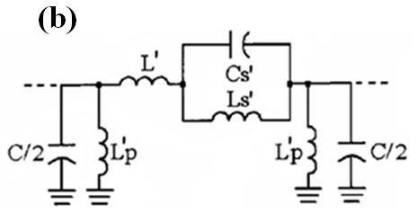 Figure 11. (a) Typical topology of a CSRR loaded microstrip line. (b) Equivalent circuit model of the unit cell.