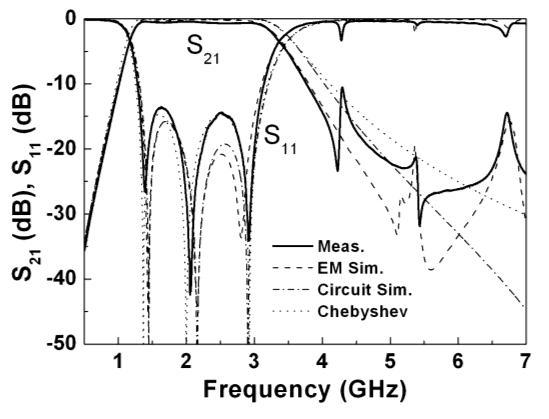 Figure 20. Layout (a), photograph (b), and frequency response (c) of the fabricated elliptic lowpass filter.Dimensions are: W = 5 mm, G = 0.55 mm, l = 6.6 mm, b = 2.42 mm, c = 2.7 mm. The strips of the meander lines are of 0.2 mm. The filter has been fabricated on the Rogers RO3010 substrate with measured dielectric constant εr= 11.2 and thickness h = 254 μm. The circuit simulation corresponds to an ideal elliptic filter with the following characteristics:order-3 elliptic-function LPF with a passband ripple of LAr = 0.1 dB, a cutoff frequency of fc= 1 GHz and a stopband attenuation of LAs = 30.52 dB with the equal-ripple stopband starting normalized frequency Ωs = 2.5. From [46], copyright 2010, IEEE; reprinted with permission.