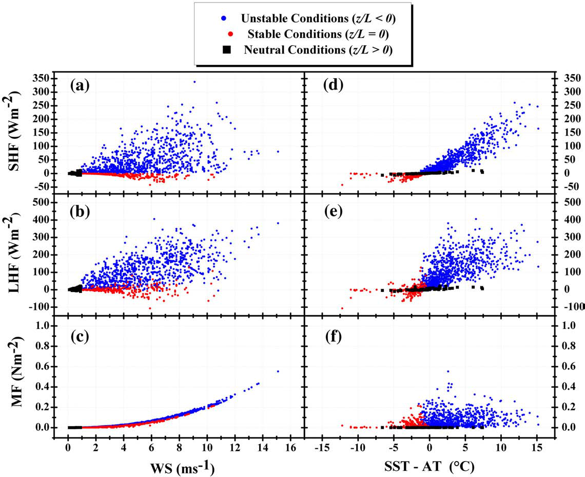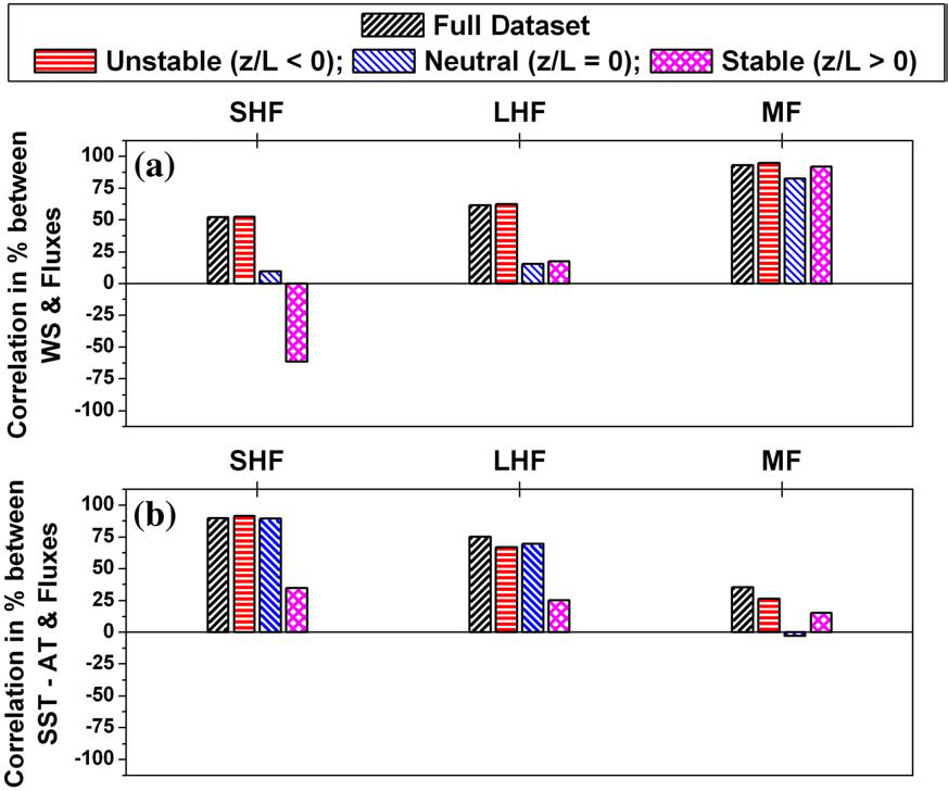 ▪ SHF Variations: SHF show good correlation with the SST–AT variations, while its WS dependence is poorly defined. For unstable conditions, SHF yields positive correlation with the WS, whereas it shows a negative correlation with WS for stable conditions.