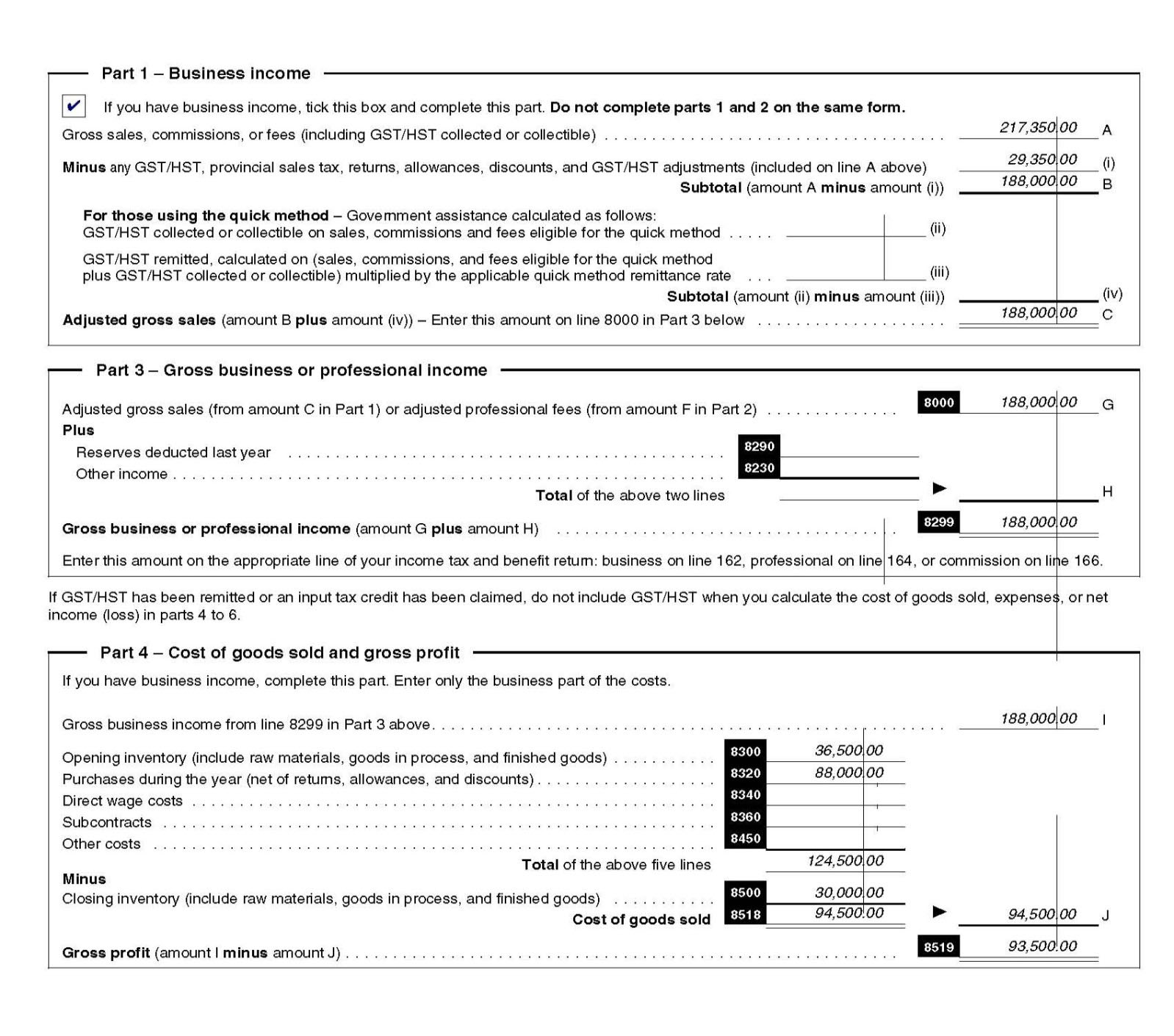 On line (i) enter any GST/HST, provincial sales tax, returns, allowances, discounts and GST/HST adjustments (included on line D) and any WIP at the end of the year you elected to exclude. Line E is the total of line D minus line (i).