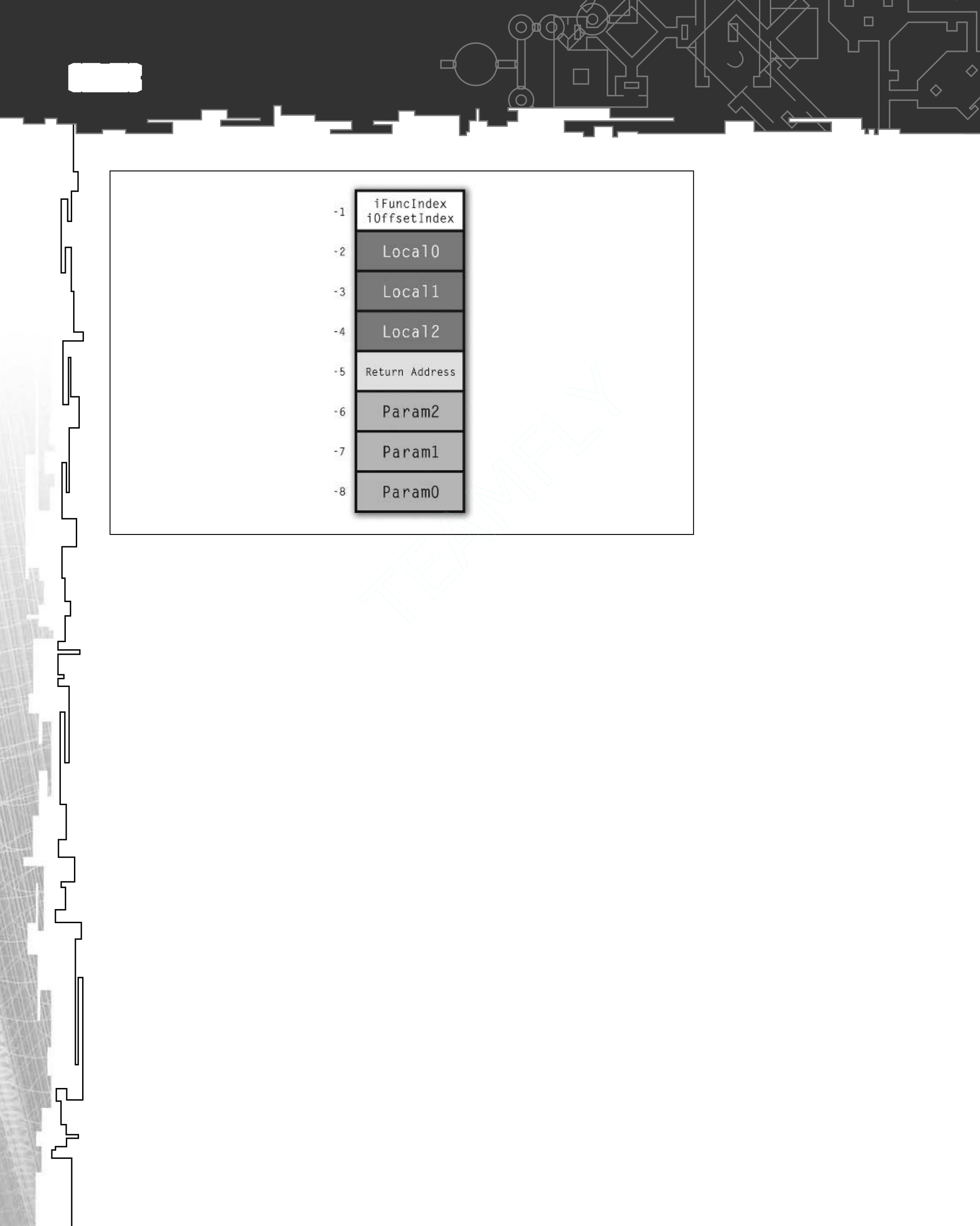 The explanation of how a function is called overlapped pretty heavily with how a function returns, so this will be quick. To return from a function, the top of the stack is popped off. This element contains both the index of the function we’re returning from, as well as the location of the previous stack frame. The first of these two pieces of information is used to retrieve the cur-rent function’s Func structure from the function table.