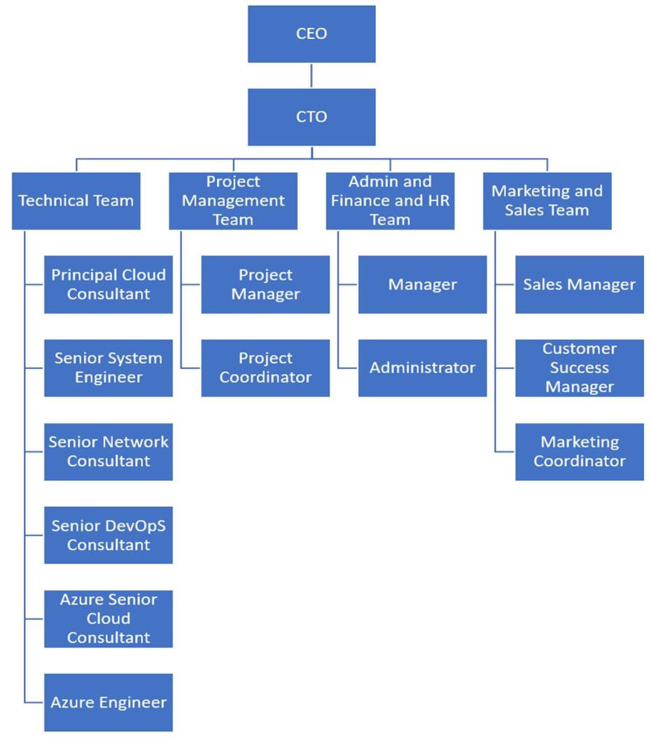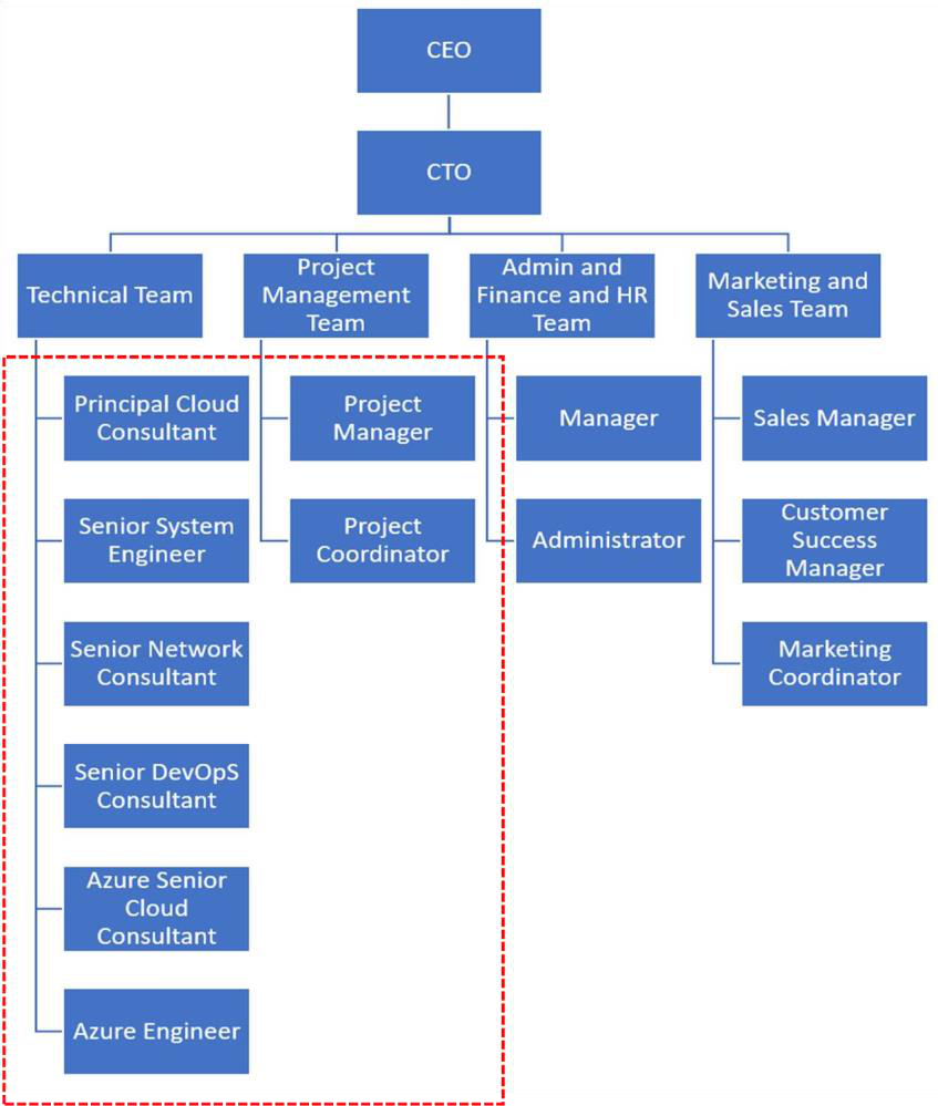 IT Infrastructure projects across a diverse range of clients that are on-time, within budget and high-quality outcomes. Their services include Azure Factory, Modern Workplace, Cyber Security, Managed Services, Hybrid Cloud, DevOps, Digital Healthcare and Business, Industry Solutions, WiFi, Modern Desktop Servicing, Windows Analytics and more. These services enable the support of IT needs across a range of locations and platforms for optimal performance, allowing companies to focus on their core business effectively and efficiently. Their organizational structure chart (figure 1) is generalized.