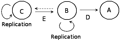 a) A = Protein, B = RNA, C = DNA, D = Translation, E = Transcription b) A = RNA, B = DNA, C = Protein, E = Transcription, D = Translation c) A = Translation, B = DNA, C = Protein, D = Transcription, E = RNA d) A = DNA, B = RNA, C = Protein, D = Transcription, E = Translation
